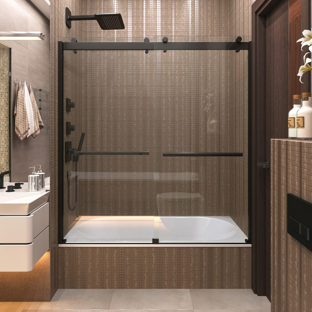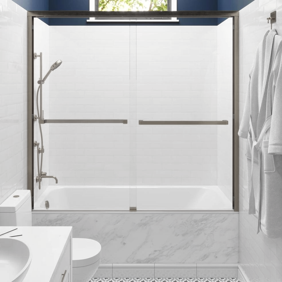 Made with adjustable 56-60″ width and 60″ or 65″ height tub. 1/4″ tempered glass protects from accidents. Available in Matte Black, Brushed Nickel, and Polished Chrome.