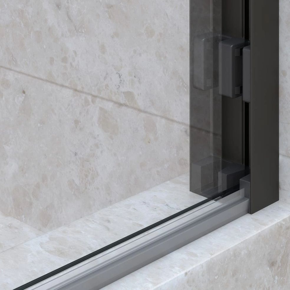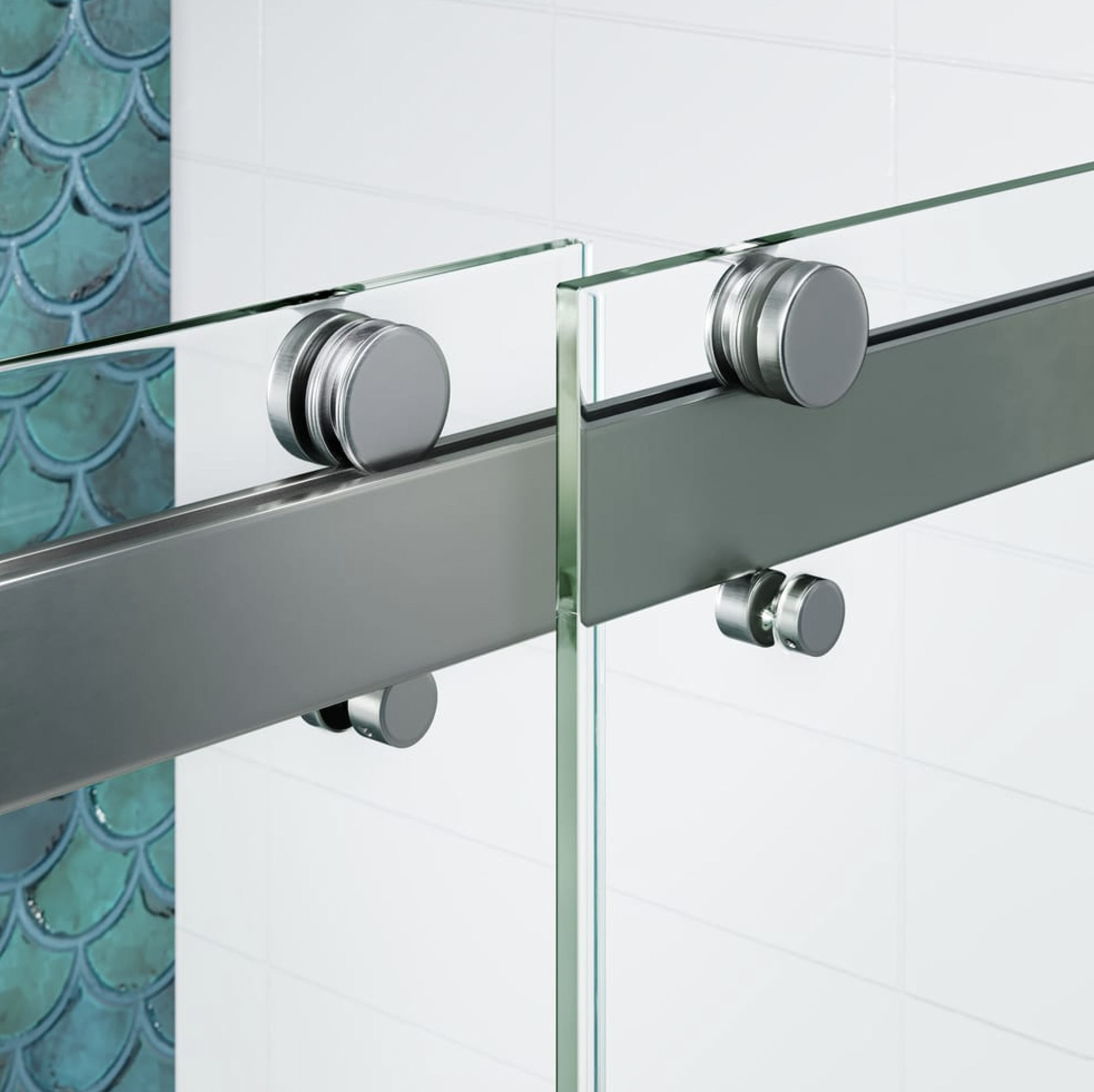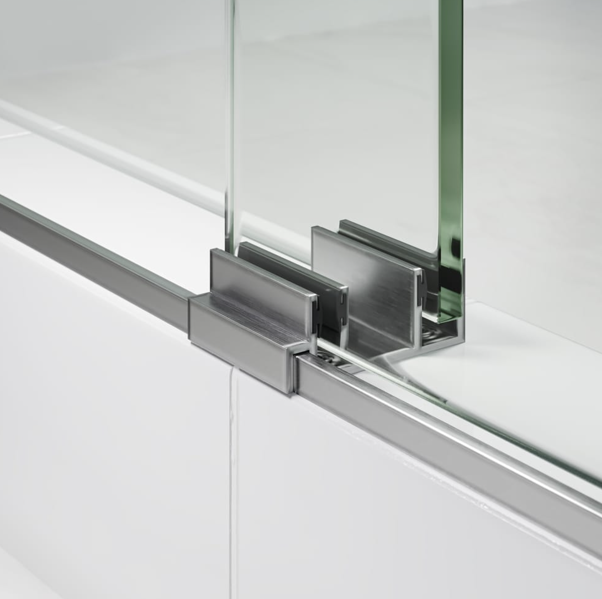 Addison’s set features frameless bypass sliding doors hung on silent top-rollers with no wall profiles and a low entry sill for a clean, open look.